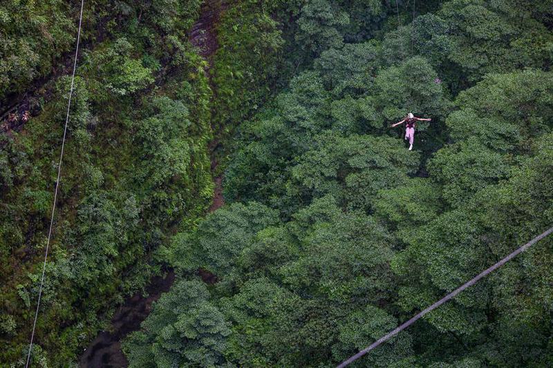 Foto yang diabadikan pada 22 Juli 2025 ini menunjukkan seorang wisatawan bermain "ayunan super raksasa" di lubang runtuhan (sinkhole) raksasa di wilayah Kaiyang, Provinsi Guizhou, China barat daya. (Carapandang/Xinhua/Ou Dongqu)