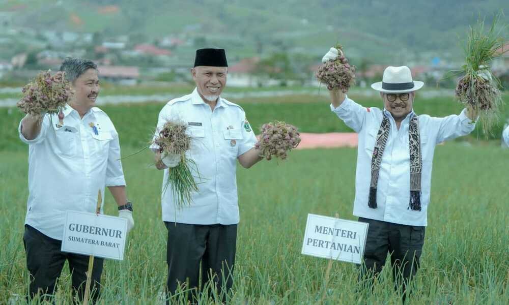 Mentan RI bersama Gubernur Sumatera Barat, Mahyeldi Ansharullah dan Bupati Solok, Epyardi Asda meninjau kawasan sentra pengembangan bawang merah nasional di Kabupaten Solok, sekaligus melakukan panen bawang bersama di Nagari/Desa Sungai Nanam, Kecamatan L