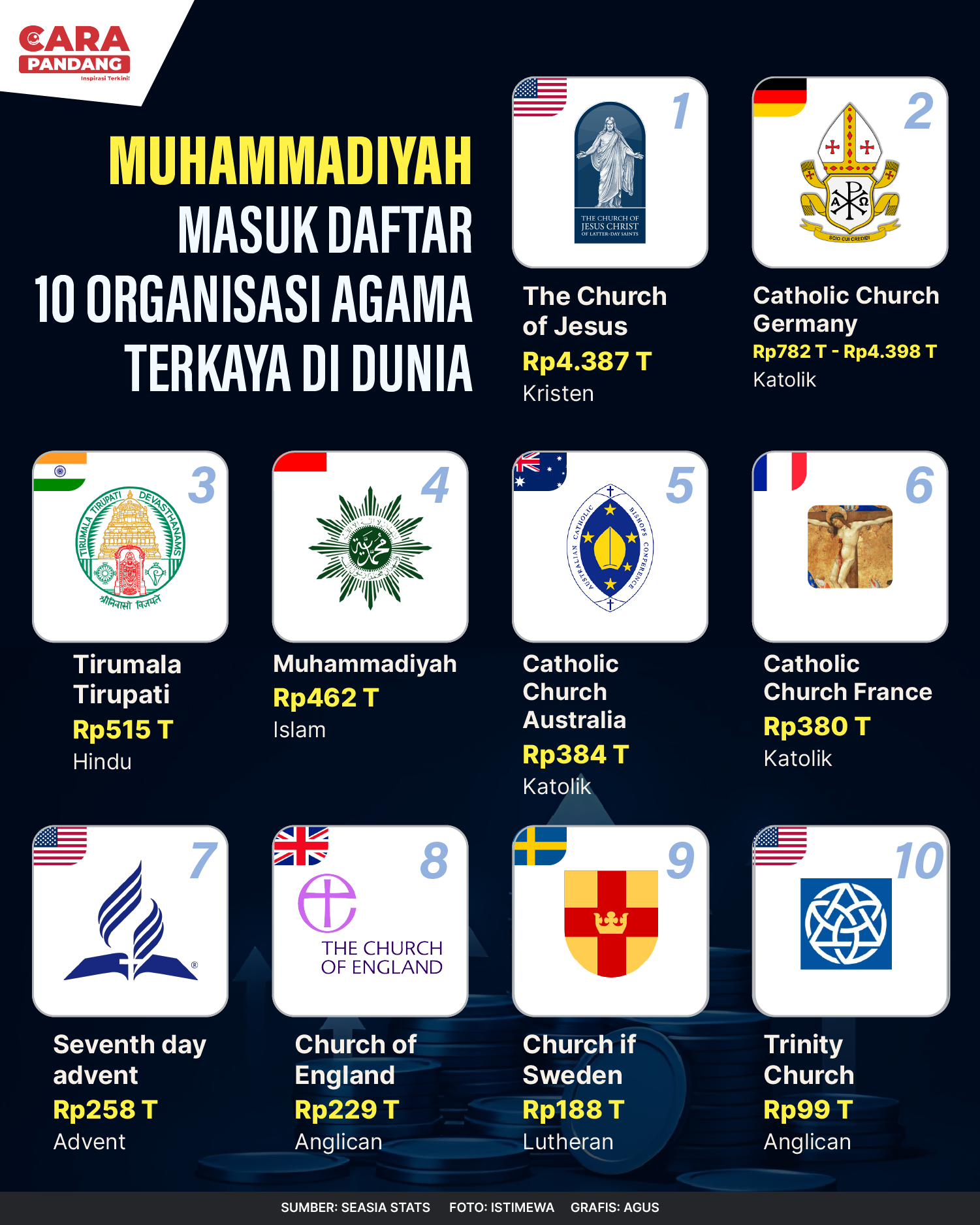 Beranda Infografis Muhammadiyah Masuk Dalam 10 Organisasi Agama Terkaya di Dunia Infografis Muhammadiyah Masuk Dalam 10 Organisasi Agama Terkaya di Dunia Penulis Amira Izzati - 24 Oktober 2025 11:12 0 Muhammadiyah Masuk Dalam 10 Organisasi Agama Terkaya di Dunia Tags Berita Sebelumnya Dokter Tifa: Buku Gibran's Black Paper Jadi Alat Bukti Pemakzulan Wapres Gibran Berita Berikutnya Hari ini Harga Dua Produk Emas di Pegadaian Naik Lagi LEAVE A REPLY Cancel reply Comment: Please enter your comment! Name:* Please enter your name here Email:* You have entered an incorrect email address! Please enter your email address here Website: Save my name, email, and website in this browser for the next time I comment. Berita Teratas Delapan Emas Lahir dari Tim Indonesia pada Hari Ketiga Pemimpin Thailand dan Kamboja Berbicara via Telepon dengan Trump, Bahas Konflik Perbatasan Program Edukasi Bermain Bantu Anak Atasi Kecemasan Saat MRI Potret Timur Tengah: Badai Musim Dingin Tewaskan Setidaknya 14 Orang di Gaza yang Porak-Poranda akibat Perang Maruarar Sirait: Kita Samakan Data, Baru Relokasi Dan Bangun Rumah Korban Banjir Sumatera Berita Terkait Berita Terkait Distribusi Bantuan Banjir Sumatra Lewat Udara Maliq - 06 Desember 2025 14:16 Dampak Banjir Aceh, Sumut dan Sumbar Zoel Rachman - 05 Desember 2025 08:47 Daftar Dosa Korupsi Netanyahu Zoel Rachman - 04 Desember 2025 12:52 Kutipan Pidato Hari Guru Nasional 2025 Maliq - 28 November 2025 12:12