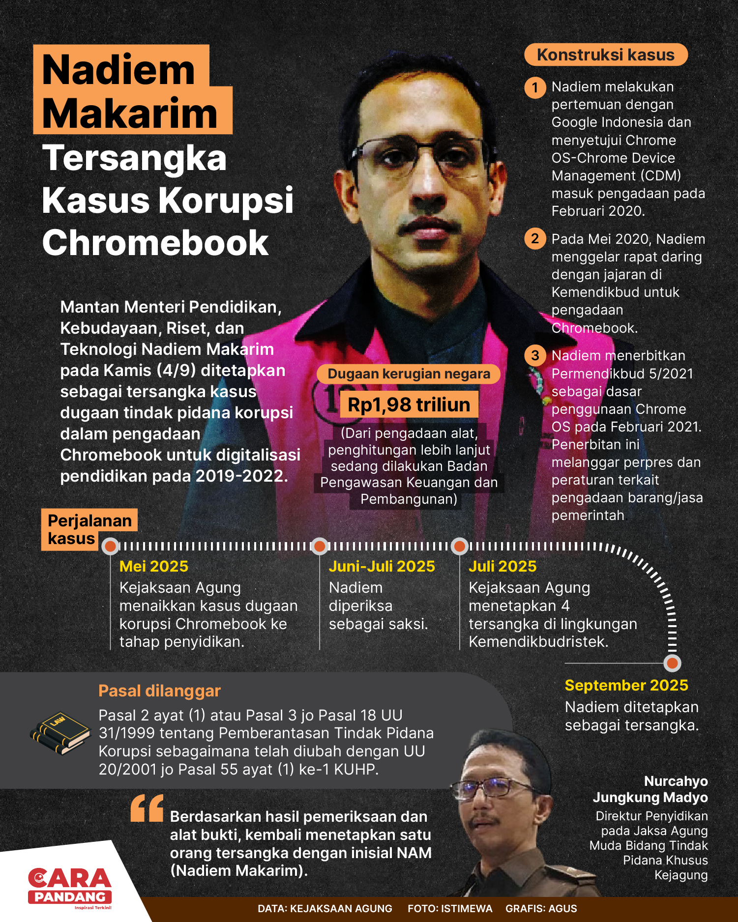 Beranda Infografis NAM, Tersangka Kasus Korupsi Chromebook Infografis NAM, Tersangka Kasus Korupsi Chromebook Penulis Amira Izzati - 06 September 2025 13:29 0 NAM, Tersangka Kasus Korupsi Chromebook Tags Berita Sebelumnya Gerhana Bulan Total Terjadi Minggu-Senin, Umat Islam Diimbau Shalat Khusuf Berita Berikutnya PIP Instrumen Penting Wujudkan Pendidikan Bermutu untuk Semua LEAVE A REPLY Cancel reply Comment: Please enter your comment! Name:* Please enter your name here Email:* You have entered an incorrect email address! Please enter your email address here Website: Save my name, email, and website in this browser for the next time I comment. Berita Teratas Pemimpin Thailand dan Kamboja Berbicara via Telepon dengan Trump, Bahas Konflik Perbatasan Potret Timur Tengah: Badai Musim Dingin Tewaskan Setidaknya 14 Orang di Gaza yang Porak-Poranda akibat Perang Program Edukasi Bermain Bantu Anak Atasi Kecemasan Saat MRI Gie, Prabowo Presiden Sekarang Masakan Italia Diakui sebagai Warisan Budaya Takbenda UNESCO Berita Terkait Berita Terkait Distribusi Bantuan Banjir Sumatra Lewat Udara Maliq - 06 Desember 2025 14:16 Dampak Banjir Aceh, Sumut dan Sumbar Zoel Rachman - 05 Desember 2025 08:47 Daftar Dosa Korupsi Netanyahu Zoel Rachman - 04 Desember 2025 12:52 Kutipan Pidato Hari Guru Nasional 2025 Maliq - 28 November 2025 12:12