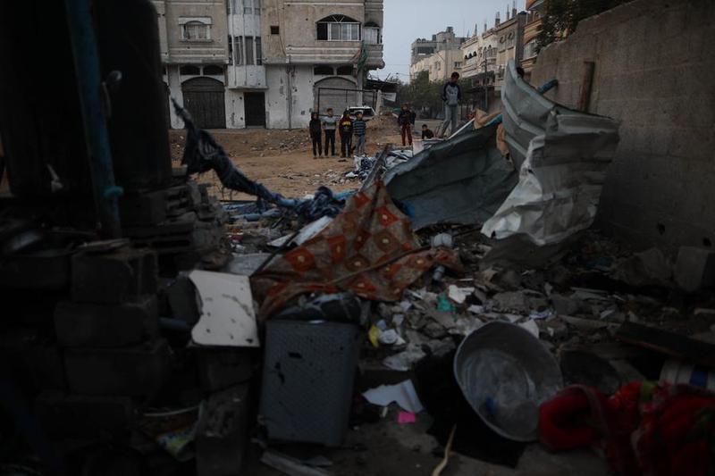 Warga Palestina terlihat di lokasi sebuah tenda yang hancur pascapengeboman Israel di kamp pengungsi al-Nuseirat di Jalur Gaza tengah pada 17 Januari 2025. (Xinhua/Marwan Dawood)