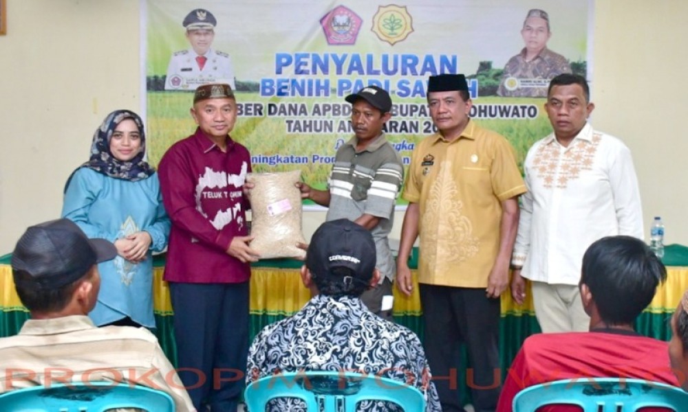 Penyaluran benih padi sawah sumber dana APBD II Kabupaten Pohuwato Tahun Anggaran 2024 secara simbolis diserahkan Bupati Pohuwato, Saipul A. Mbuinga kepada salah satu perwakilan petani, di aula Kantor Desa Mootilango, Kecamatan Duhiadaa.
