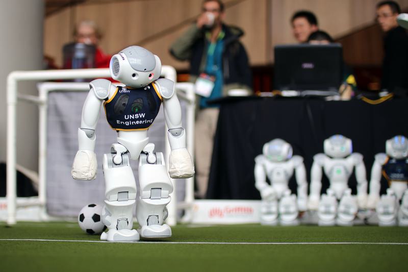 Pertandingan sepak bola robot digelar saat Konferensi Gabungan Internasional tentang Kecerdasan Buatan (International Joint Conference on Artificial Intelligence) 2017 di Melbourne, Australia, pada 22 Agustus 2017. (Carapandang/Xinhua/Gui Qing)