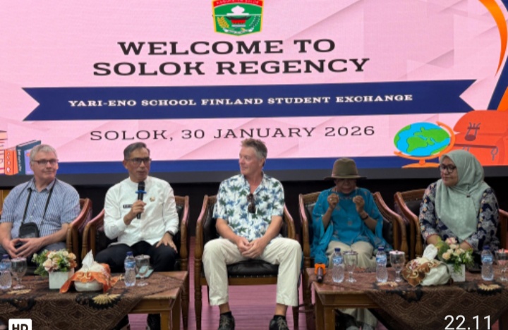 SOLOK, CARAPANDANG - Pemerintah Kabupaten Solok menyambut kedatangan audiensi peserta Program Pertukaran Pelajar Yari–Eno School Finland dalam sebuah pertemuan hangat dan mengesankan, yang dilaksanakan di aula pertemuan gedung C Setda pada Jumat (30/01/2026). Hadir mewakili Bupati Solok, Sekretaris Daerah Medison S. Sos, M.Si, beserta beberapa Kepala OPD terkait.