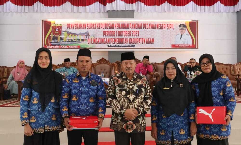 Pada periode kenaikan pangkat 1 Oktober 2023 ini Pemkab Agam melalui BKPSDM Kabupaten Agam serahkan SK kepada 484 PNS dan  penyerahannya dilaksanakan di Balairung Rumah Dinas Bupati Agam Padang Baru Lubuk Basung, Kamis (21/9).