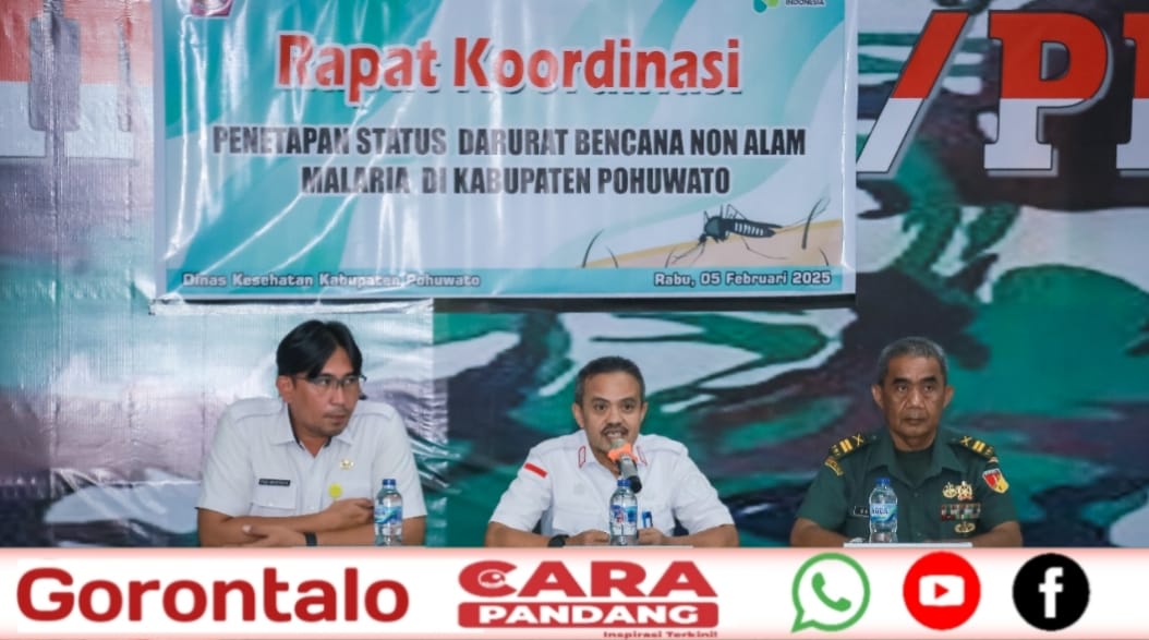 Rapat Koordinasi Penetapan Status Darurat Bencana Non Alam Malaria di Kabupaten Pohuwato dilaksanakan di Aula Kodim 1313 Pohuwato turut dihadiri Sekda Iskandar Datau, Rabu. (05/02/2025).