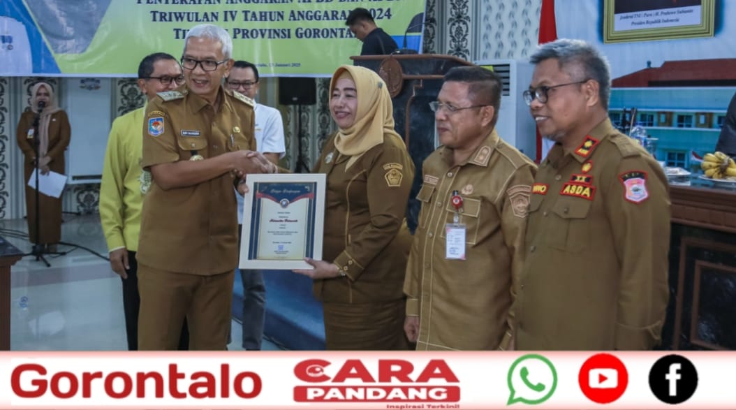 Piagam penghargaan tersebut diserahkan dalam kegiatan Rapat Koordinasi dan Evaluasi (Rakorev) Triwulan IV yang berlangsung di Ruang Dulohupa, Kantor Gubernur Gorontalo, Senin (13/01/2025).
