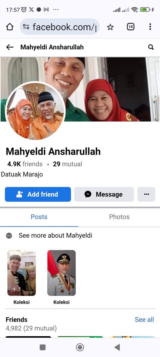 SUMBAR, CARAPANDANG - Seluruh masyarakat Sumatera Barat (Sumbar) diminta untuk mengabaikan pesan dari akun facebook atas nama Gubernur Sumbar, Mahyeldi Ansharullah, yang menggunakan foto profil bersama Ketua TP PKK Sumbar Harneli Mahyeldi, dengan pose sama-sama mengacungkan jari telunjuk. Sebab akhir-akhir ini, beberapa pihak mengaku mendapatkan pesan terkait kemudahan proposal bantuan dari akun tersebut.