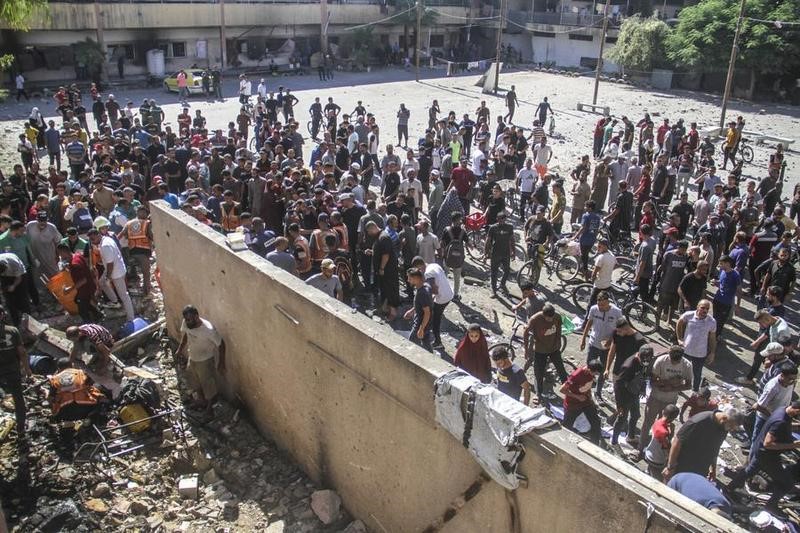 Orang-orang terlihat di sekolah al-Faluja pascaserangan pesawat Israel di kamp pengungsi Jabalia barat, Jalur Gaza utara, pada 26 September 2024. (Xinhua/Mahmoud Zaki)