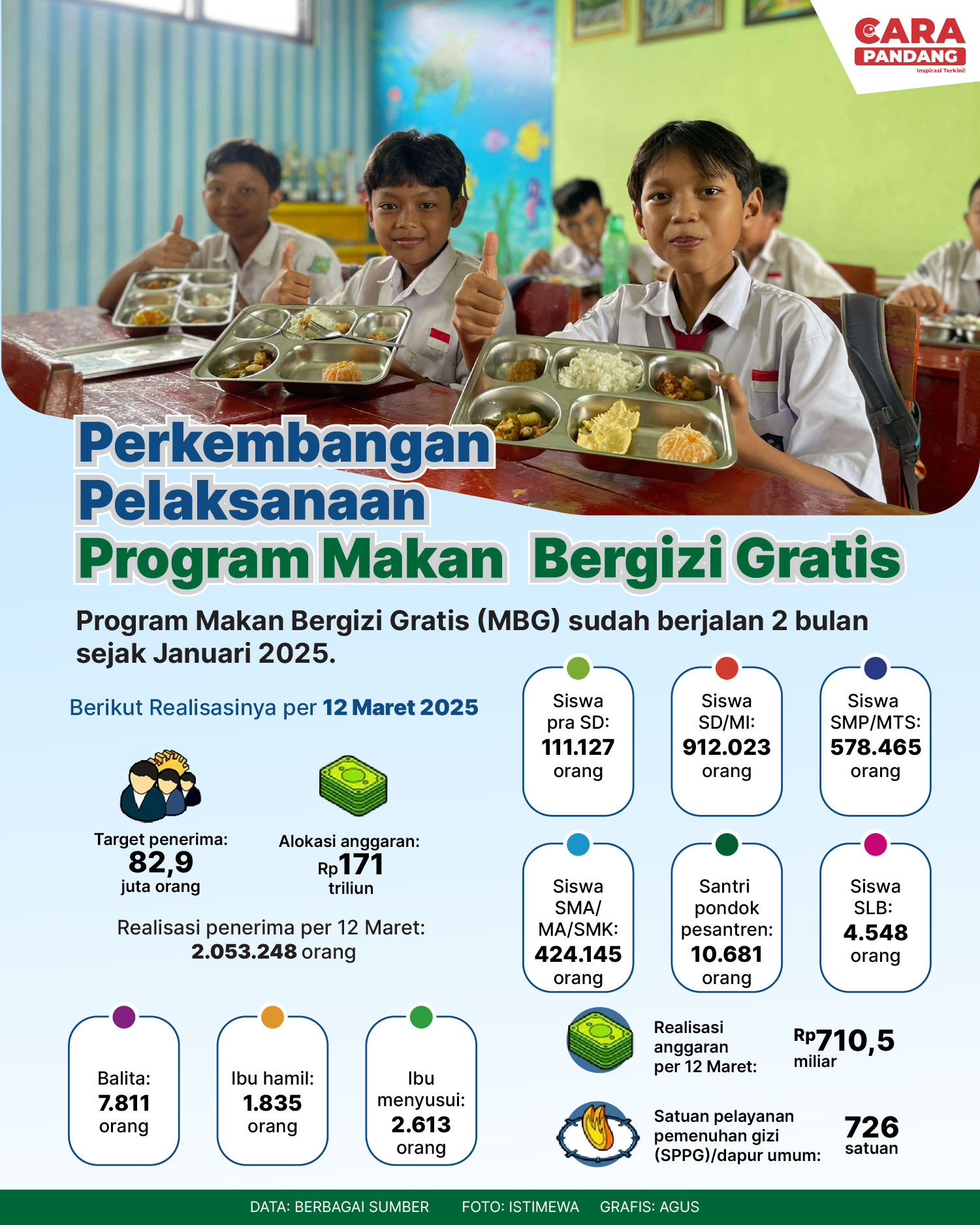 Beranda Infografis Perkembangan Pelaksanaan Program MBG Infografis Perkembangan Pelaksanaan Program MBG Perkembangan Pelaksanaan Program MBG. Penulis Edo Soeryadi - 03 April 2025 08:53 0 CARAPANDANG.COM - Perkembangan Pelaksanaan Program MBG. Tags MBG Siswa Program Target Berita Sebelumnya Arus Balik Lebaran 2025, Ini Diskon Tarif Tol 20 Persen Berita Berikutnya PIP Instrumen Penting Wujudkan Pendidikan Bermutu untuk Semua LEAVE A REPLY Cancel reply Comment: Please enter your comment! Name:* Please enter your name here Email:* You have entered an incorrect email address! Please enter your email address here Website: Save my name, email, and website in this browser for the next time I comment. Berita Teratas Pemimpin Thailand dan Kamboja Berbicara via Telepon dengan Trump, Bahas Konflik Perbatasan Potret Timur Tengah: Badai Musim Dingin Tewaskan Setidaknya 14 Orang di Gaza yang Porak-Poranda akibat Perang Program Edukasi Bermain Bantu Anak Atasi Kecemasan Saat MRI Gie, Prabowo Presiden Sekarang Masakan Italia Diakui sebagai Warisan Budaya Takbenda UNESCO Berita Terkait Berita Terkait Distribusi Bantuan Banjir Sumatra Lewat Udara Maliq - 06 Desember 2025 14:16 Dampak Banjir Aceh, Sumut dan Sumbar Zoel Rachman - 05 Desember 2025 08:47 Daftar Dosa Korupsi Netanyahu Zoel Rachman - 04 Desember 2025 12:52 Kutipan Pidato Hari Guru Nasional 2025 Maliq - 28 November 2025 12:12