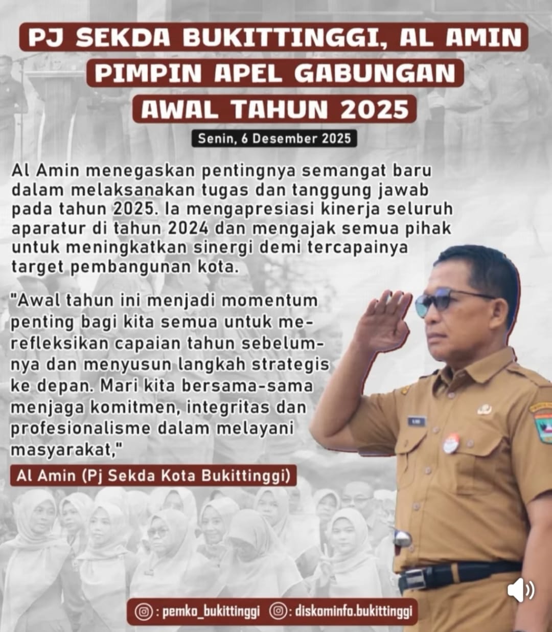 BUKITTINGGI, CARAPANDANG - Pj Sekretaris Daerah (Sekda) Bukittinggi, Al Amin, memimpin apel gabungan awal tahun 2025 yang berlangsung di halaman Balaikota Bukittinggi, Senin, 6 Desember 2025. Kegiatan tersebut dihadiri oleh seluruh ASN dan pejabat di lingkungan Pemerintah Kota Bukittinggi.