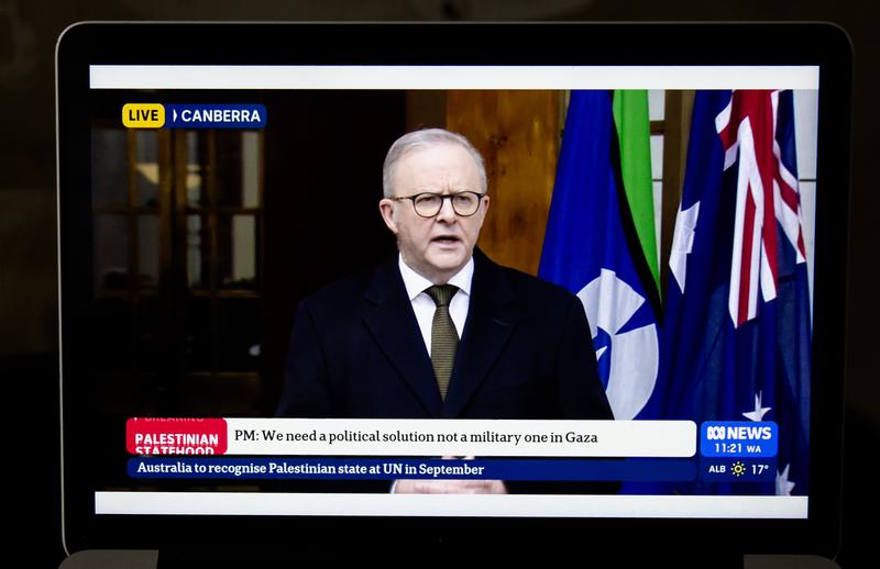 Layar laptop ini menunjukkan sebuah siaran konferensi pers Perdana Menteri Australia Anthony Albanese pada 11 Agustus 2025. Albanese pada Senin (11/8) mengatakan bahwa Australia akan secara resmi mengakui Negara Palestina dalam sesi ke-80 Majelis Umum Perserikatan Bangsa-Bangsa yang dijadwalkan pada September mendatang. (Carapandang/Xinhua/Ma Ping)