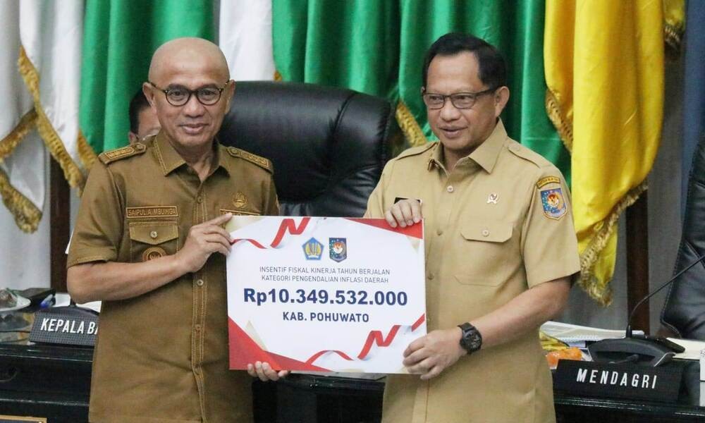 POHUWATO, CARAPANDANG.COM - Kabupaten Pohuwato kembali mendapat insentif fiskal dari pemerintah pusat melalui Kementerian Dalam Negeri dan Kementerian Keuangan Republik Indonesia. Dimana dari 34 pemerintah daerah yang terdiri 3 provinsi, 25 kabupaten dan 6 kota, Kabupaten Pohuwato termasuk di dalamnya bersama dengan Kabupaten Boalemo dan Pemda Provinsi Gorontalo.