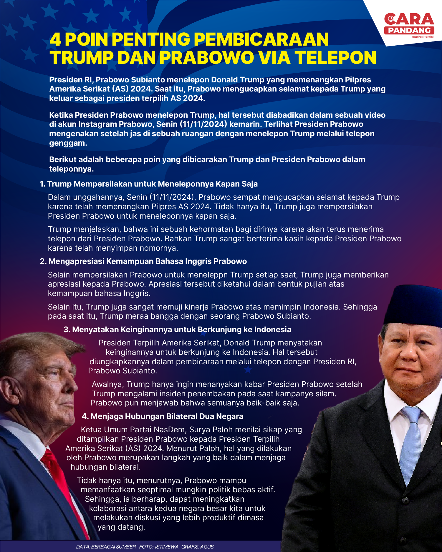 CARAPANDANG - Presiden RI, Prabowo Subianto menelepon Donald Trump yang memenangkan Pilpres Amerika Serikat (AS) 2024. Saat itu, Prabowo mengucapkan selamat kepada Trump yang keluar sebagai presiden terpilih AS 2024.