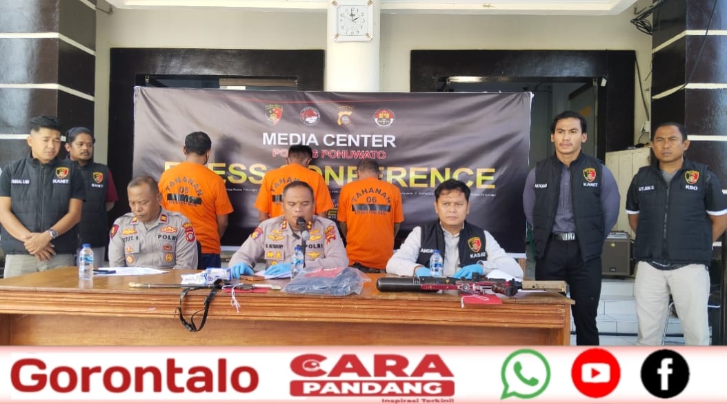 POHUWATO, CARAPANDANG - Kepolisian Resor (Polres) Pohuwato menggelar konferensi pers terkait kasus dugaan penganiayaan berat berupa penembakan dan pembacokan yang terjadi di Desa Butungale, Kecamatan Popayato Barat, Kabupaten Pohuwato.