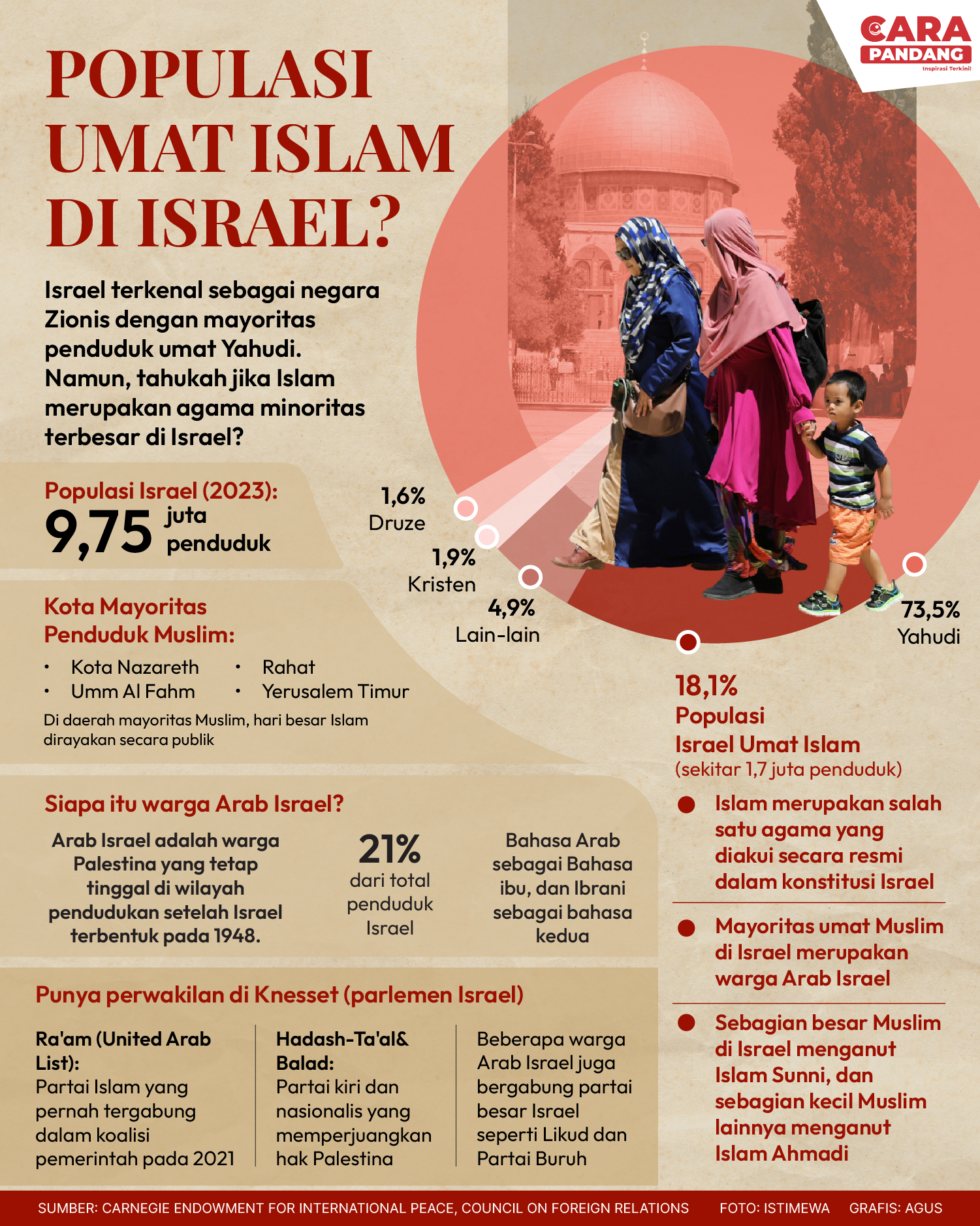 Beranda Infografis Populasi Umat Islam di Israel Infografis Populasi Umat Islam di Israel Populasi Umat Islam di Israel. Penulis Edo Soeryadi - 10 April 2025 05:45 0 CARAPANDANG.COM - Populasi Umat Islam di Israel. Tags Israel Gaza Perang Palestina Berita Sebelumnya Bangladesh Kutuk Keras Pembantaian Massal oleh Israel di Gaza Berita Berikutnya DPR Desak Pemerintah Gerak Cepat Atasi Krisis Air Bersih di Wilayah Terdampak Banjir Sumatera LEAVE A REPLY Cancel reply Comment: Please enter your comment! Name:* Please enter your name here Email:* You have entered an incorrect email address! Please enter your email address here Website: Save my name, email, and website in this browser for the next time I comment. Berita Teratas Pemimpin Thailand dan Kamboja Berbicara via Telepon dengan Trump, Bahas Konflik Perbatasan Potret Timur Tengah: Badai Musim Dingin Tewaskan Setidaknya 14 Orang di Gaza yang Porak-Poranda akibat Perang Program Edukasi Bermain Bantu Anak Atasi Kecemasan Saat MRI Gie, Prabowo Presiden Sekarang Masakan Italia Diakui sebagai Warisan Budaya Takbenda UNESCO Berita Terkait Berita Terkait Distribusi Bantuan Banjir Sumatra Lewat Udara Maliq - 06 Desember 2025 14:16 Dampak Banjir Aceh, Sumut dan Sumbar Zoel Rachman - 05 Desember 2025 08:47 Daftar Dosa Korupsi Netanyahu Zoel Rachman - 04 Desember 2025 12:52 Kutipan Pidato Hari Guru Nasional 2025 Maliq - 28 November 2025 12:12