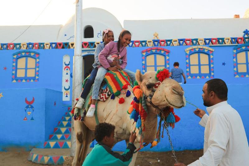 Para wisatawan mengunjungi desa etnis Nubia Gharb Sohail yang berlokasi di Aswan, Mesir, pada 24 November 2024. (Xinhua/Sui Xiankai)