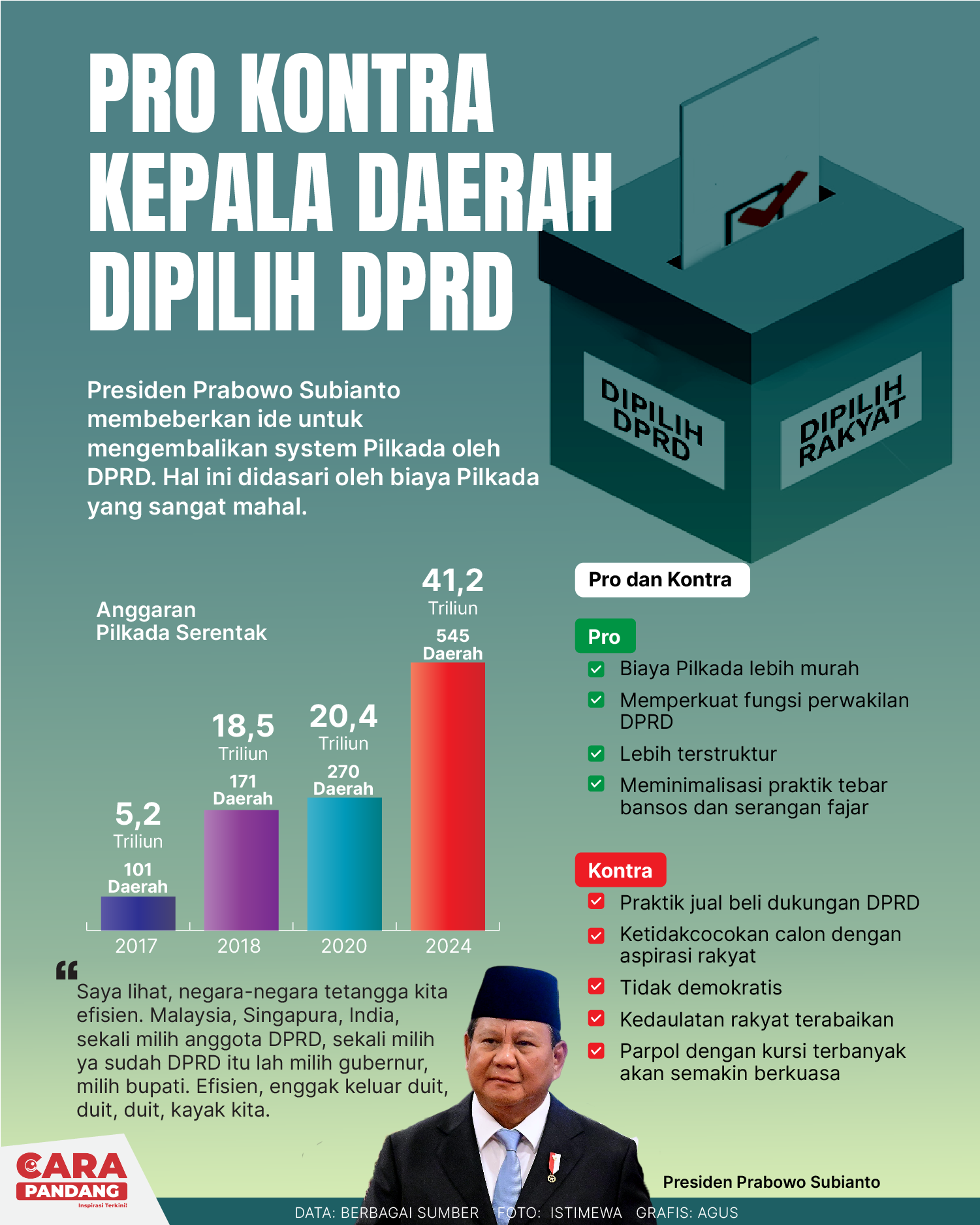 Beranda Infografis Pro Kontra Kepala Daerah dipilih DPRD Infografis Pro Kontra Kepala Daerah dipilih DPRD Penulis Edo Soeryadi - 23 Desember 2024 23:47 0 CARAPANDANG - Presiden Prabowo Subianto membeberkan ide untuk mengembalikan sistem pilkada ke DPRD. Tags Berita Sebelumnya Wakil Bupati Pohuwato Beri Ucapan Selamat untuk Muhammad Rizky Alhasni atas Gelar Magister Hukum Berita Berikutnya Para Tahanan Pro-Palestina yang Mogok Makan di Inggris Hadapi Risiko Kematian LEAVE A REPLY Cancel reply Comment: Please enter your comment! Name:* Please enter your name here Email:* You have entered an incorrect email address! Please enter your email address here Website: Save my name, email, and website in this browser for the next time I comment. Berita Teratas Pemimpin Thailand dan Kamboja Berbicara via Telepon dengan Trump, Bahas Konflik Perbatasan Potret Timur Tengah: Badai Musim Dingin Tewaskan Setidaknya 14 Orang di Gaza yang Porak-Poranda akibat Perang Program Edukasi Bermain Bantu Anak Atasi Kecemasan Saat MRI Gie, Prabowo Presiden Sekarang Maruarar Sirait: Kita Samakan Data, Baru Relokasi Dan Bangun Rumah Korban Banjir Sumatera Berita Terkait Berita Terkait Distribusi Bantuan Banjir Sumatra Lewat Udara Maliq - 06 Desember 2025 14:16 Dampak Banjir Aceh, Sumut dan Sumbar Zoel Rachman - 05 Desember 2025 08:47 Daftar Dosa Korupsi Netanyahu Zoel Rachman - 04 Desember 2025 12:52 Kutipan Pidato Hari Guru Nasional 2025 Maliq - 28 November 2025 12:12