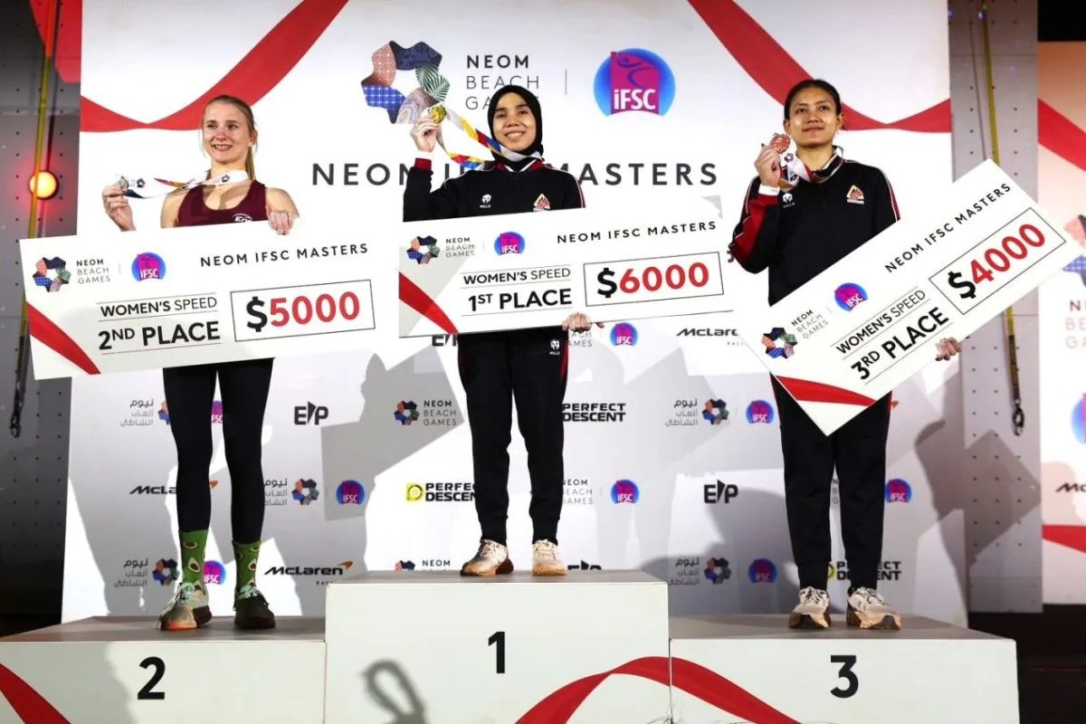 CARAPANDANG - Atlet panjat tebing putri Indonesia Rajiah Sallsabillah berhasil menjuarai nomor speed climbing pada Neom International Federation of Sport Climbing (IFSC) Master.