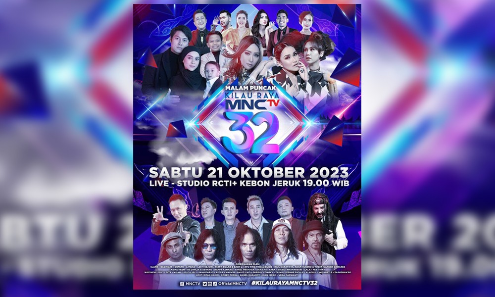 MNCTV menayangkan secara langsung ‘Malam Puncak Kilau Raya MNCTV 32’ pada Sabtu, 21 Oktober 2023, pukul 19.00 WIB diselenggarakan di Studio RCTI+, MNC Studios, Kebon Jeruk.