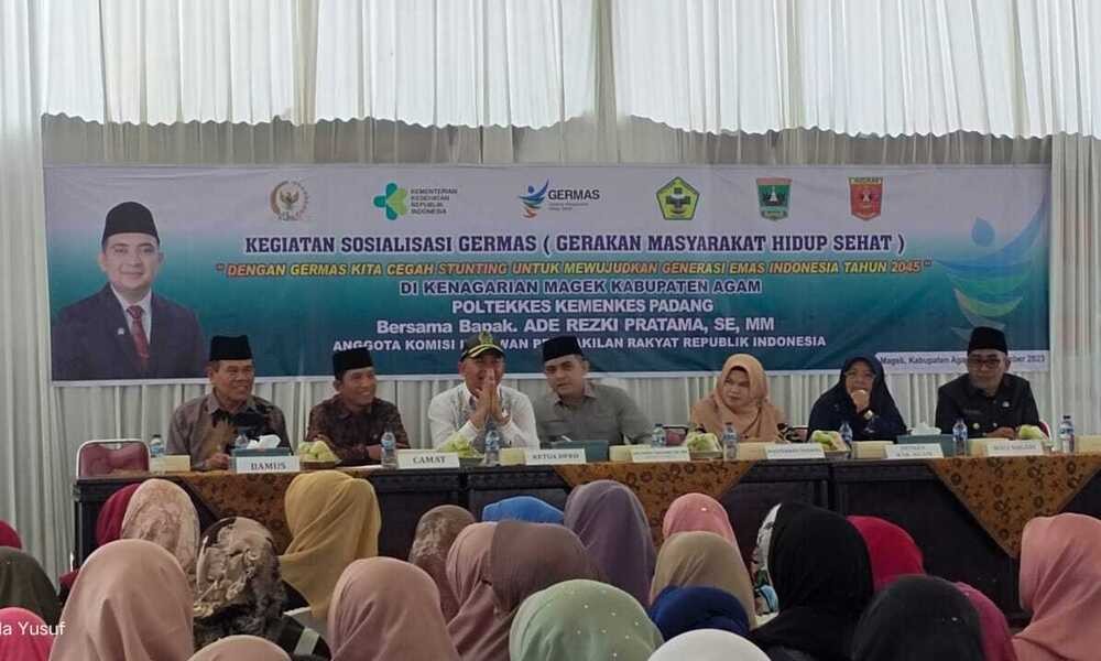 AGAM, CARAPANDANG.COM - Ratusan masyarakat Kenagarian  Magek menghadiri keegiatan sosialisasi Germas (Gerakan Masyarakat Hidup Sehat ) untuk mewujudkan generasi emas Indonesia tahun 2045 bersama bapak Ade Rezki Pratama, SE., MM., dan Poltekkes Kemenkes Padang di Kenagarian Kamang Magek Kabupaten Agam, Kamis (14/23).