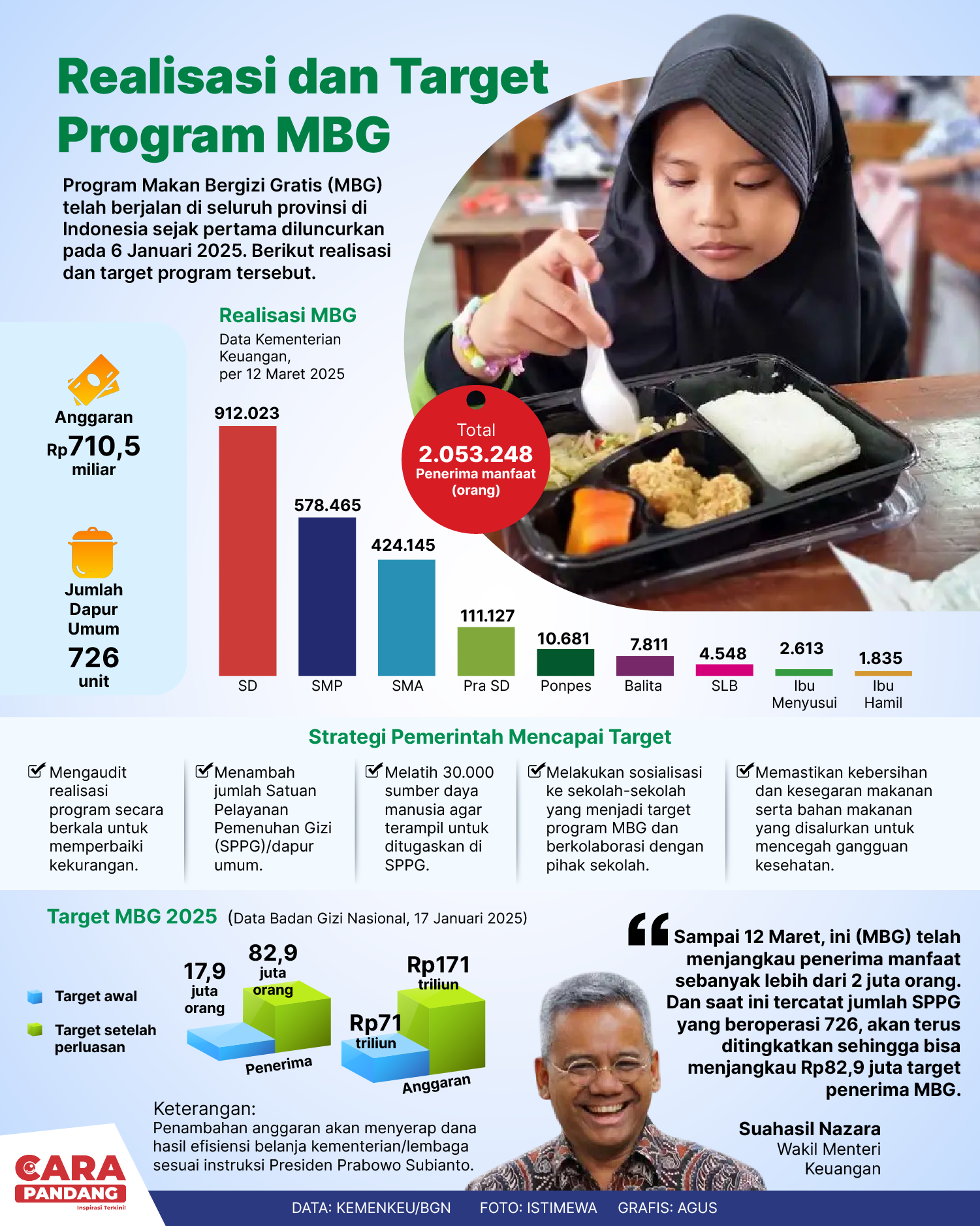 Beranda Infografis Realisasi dan Target Program MBG Infografis Realisasi dan Target Program MBG Realisasi dan Target Program MBG. Penulis Edo Soeryadi - 18 Maret 2025 08:42 0 CARAPANDANG.COM - Realisasi dan Target Program MBG. Tags MBG Siswa Program Target Berita Sebelumnya Makin Ngeri! Harga Emas Akhirnya Ditutup di US$ 3.000 Berita Berikutnya TNI AU Kerahkan A400M untuk Antar Logistik ke Lokasi Bencana Aceh LEAVE A REPLY Cancel reply Comment: Please enter your comment! Name:* Please enter your name here Email:* You have entered an incorrect email address! Please enter your email address here Website: Save my name, email, and website in this browser for the next time I comment. Berita Teratas Pemimpin Thailand dan Kamboja Berbicara via Telepon dengan Trump, Bahas Konflik Perbatasan Potret Timur Tengah: Badai Musim Dingin Tewaskan Setidaknya 14 Orang di Gaza yang Porak-Poranda akibat Perang Program Edukasi Bermain Bantu Anak Atasi Kecemasan Saat MRI Maruarar Sirait: Kita Samakan Data, Baru Relokasi Dan Bangun Rumah Korban Banjir Sumatera Gie, Prabowo Presiden Sekarang Berita Terkait Berita Terkait Distribusi Bantuan Banjir Sumatra Lewat Udara Maliq - 06 Desember 2025 14:16 Dampak Banjir Aceh, Sumut dan Sumbar Zoel Rachman - 05 Desember 2025 08:47 Daftar Dosa Korupsi Netanyahu Zoel Rachman - 04 Desember 2025 12:52 Kutipan Pidato Hari Guru Nasional 2025 Maliq - 28 November 2025 12:12