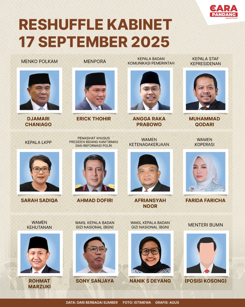 Beranda Infografis Reshuffle Kabinet 17 September 2025 Infografis Reshuffle Kabinet 17 September 2025 Reshuffle Kabinet 17 September 2025. Penulis Edo Soeryadi - 18 September 2025 18:17 0 CARAPANDANG.COM - Reshuffle Kabinet 17 September 2025. Tags Infografik Reshuffle Kabinet 2025 Berita Sebelumnya Dinas Keamanan Rusia Gagalkan Upaya Pembunuhan di St. Petersburg Berita Berikutnya Para Tahanan Pro-Palestina yang Mogok Makan di Inggris Hadapi Risiko Kematian LEAVE A REPLY Cancel reply Comment: Please enter your comment! Name:* Please enter your name here Email:* You have entered an incorrect email address! Please enter your email address here Website: Save my name, email, and website in this browser for the next time I comment. Berita Teratas Pemimpin Thailand dan Kamboja Berbicara via Telepon dengan Trump, Bahas Konflik Perbatasan Program Edukasi Bermain Bantu Anak Atasi Kecemasan Saat MRI Potret Timur Tengah: Badai Musim Dingin Tewaskan Setidaknya 14 Orang di Gaza yang Porak-Poranda akibat Perang Gie, Prabowo Presiden Sekarang Maruarar Sirait: Kita Samakan Data, Baru Relokasi Dan Bangun Rumah Korban Banjir Sumatera Berita Terkait Berita Terkait Distribusi Bantuan Banjir Sumatra Lewat Udara Maliq - 06 Desember 2025 14:16 Dampak Banjir Aceh, Sumut dan Sumbar Zoel Rachman - 05 Desember 2025 08:47 Daftar Dosa Korupsi Netanyahu Zoel Rachman - 04 Desember 2025 12:52 Kutipan Pidato Hari Guru Nasional 2025 Maliq - 28 November 2025 12:12