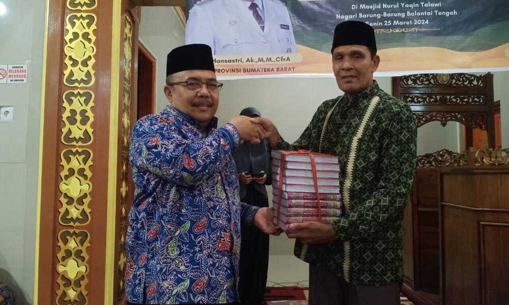 SUMBAR, CARAPANDANG.COM - Sekretaris Daerah Provinsi Sumatera Barat (Sekda Sumbar), Hansastri, memimpin rombongan Tim Safari Ramadhan (TSR) Provinsi berkunjung ke Masjid Nurul Yaqin Talawi, Nagari Barung Barung Balantai, Kecamatan Koto XI Tarusan, Senin (25/03/2024). Dalam kesempatan itu, Sekda kembali menyampaikan duka mendalam kepada warga Kabupaten Pasisir Selatan, atas musibah banjir yang melanda pada 7 Maret lalu.