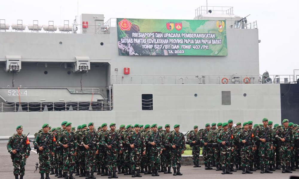 CARAPANDANG - Setelah melewati proses pengecekan persiapan pasukan, akhirnya Satgas Yonif 527/BY yang dipimpin Danyonif 527/BY, Letkol Inf Ragil Jaka Utama, diberangkatkan ke Papua dalam misi Satgas Teritorial. Mereka berangkat dengan Kapal KRI Teluk Palu 523-4 melalui Dermaga Ujung Lantamal 2, Surabaya, Jawa Timur.