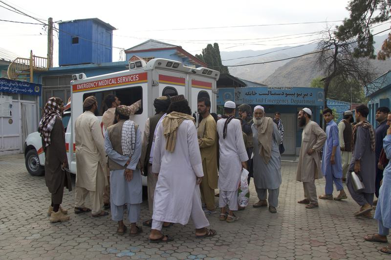 Orang-orang berkumpul di dekat ambulans di sebuah rumah sakit di Provinsi Kunar, Afghanistan, 1 September 2025. (Xinhua/Qazafi)
