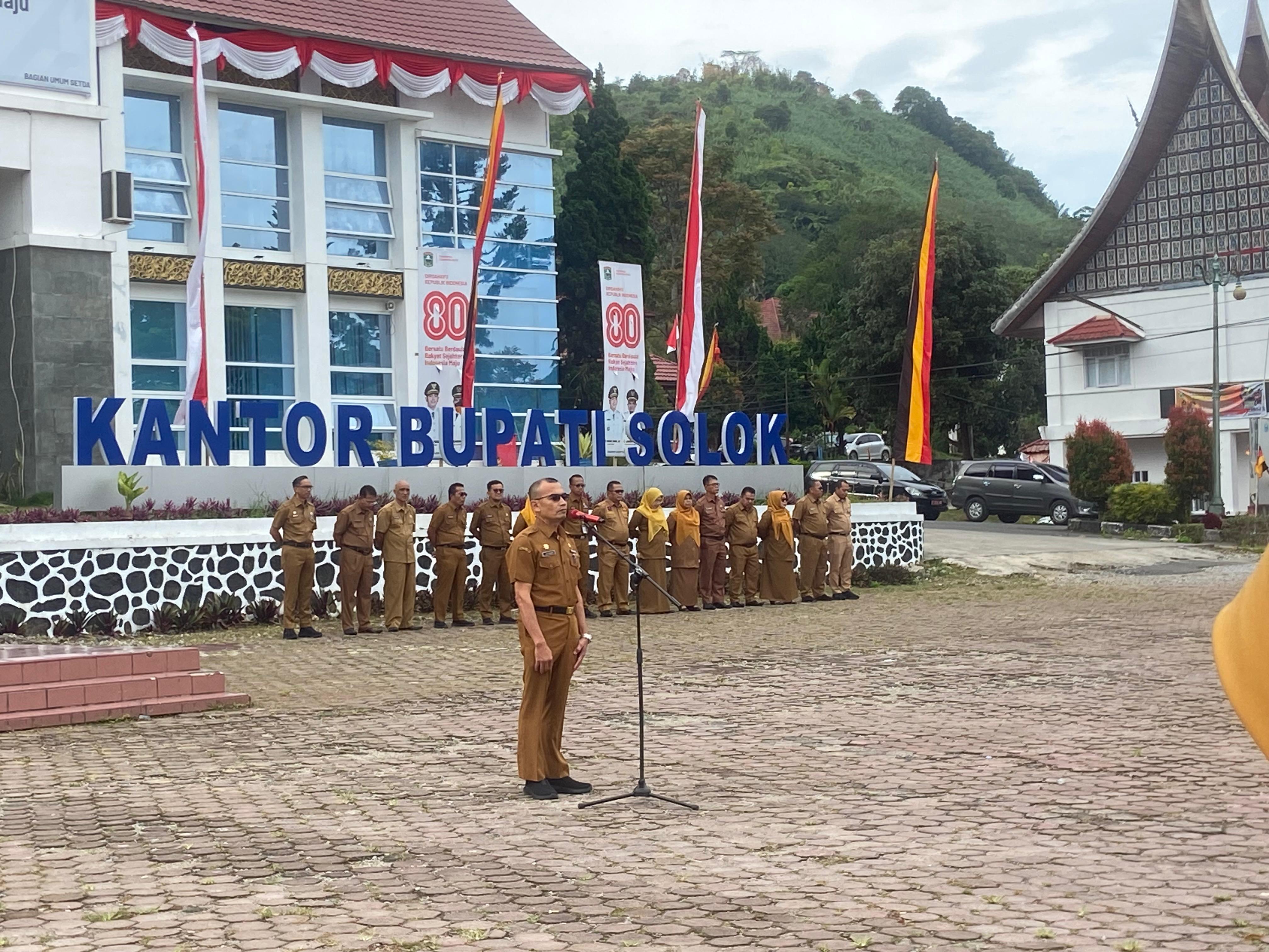 SOLOK, CARAPANDANG - Pemerintah Kabupaten Solok melaksanakan apel pagi pada Senin 01 September 2025 di Halaman Kantor Bupati Solok, Arosuka. Apel pagi ini dipimpin oleh Sekwan Zaitul Ikhlas. Kegiatan ini juga diikuti oleh Sekretaris Daerah Medison, Para Staf Ahli, Para Asisten  serta Kepala OPD dan seluruh Aparatur Sipil Negara (ASN) dan tenaga honorer di lingkungan Pemerintah Kabupaten Solok.