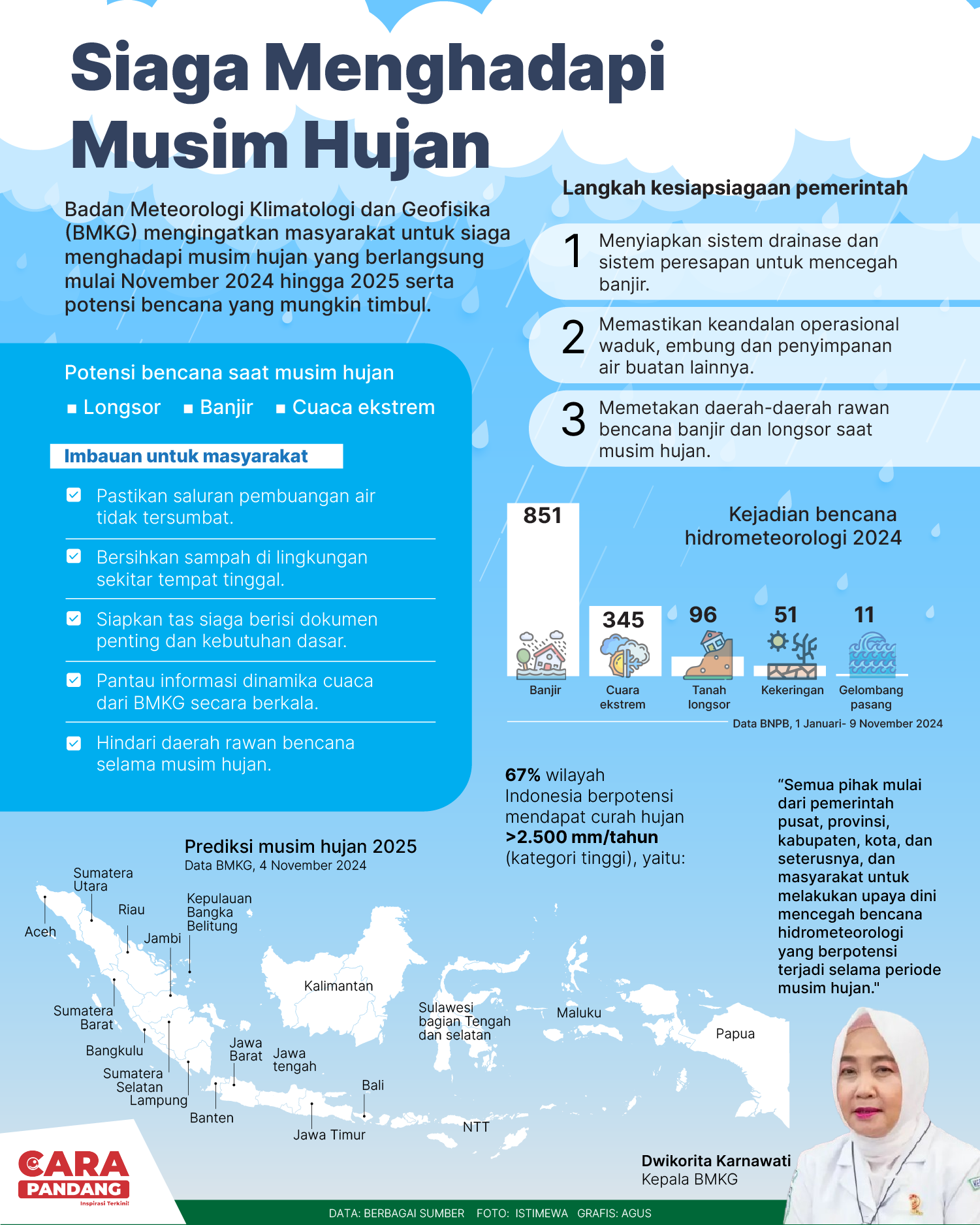 CARAPANDANG - Badan Meteorologi Klimatologi dan Geofisika (BMKG) mengingatkan masyarakat untuk siaga menghadapi musim hujan yang berlangsung mulai November 2024 hingga 2025 serta potensi bencana yang mungkin timbul.