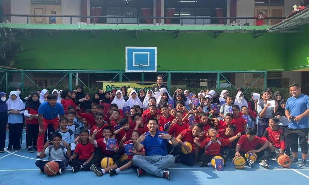 CARAPANDANG - Mantan pemain IBL dari tim Satria Muda Ronaldo Sitepu menyambangi SDN Cempaka Putih Barat 17 dalam program Youth Leader untuk menyosialisasikan Piala Dunia FIBA 2023 dan kampanye "Basketball for Good".