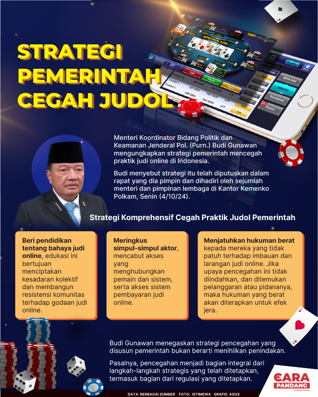 CARAPANDANG - Menteri Koordinator Bidang Politik dan Keamanan Jenderal Pol. (Purn.) Budi Gunawan mengungkapkan strategi pemerintah mencegah praktik judi online di Indonesia.