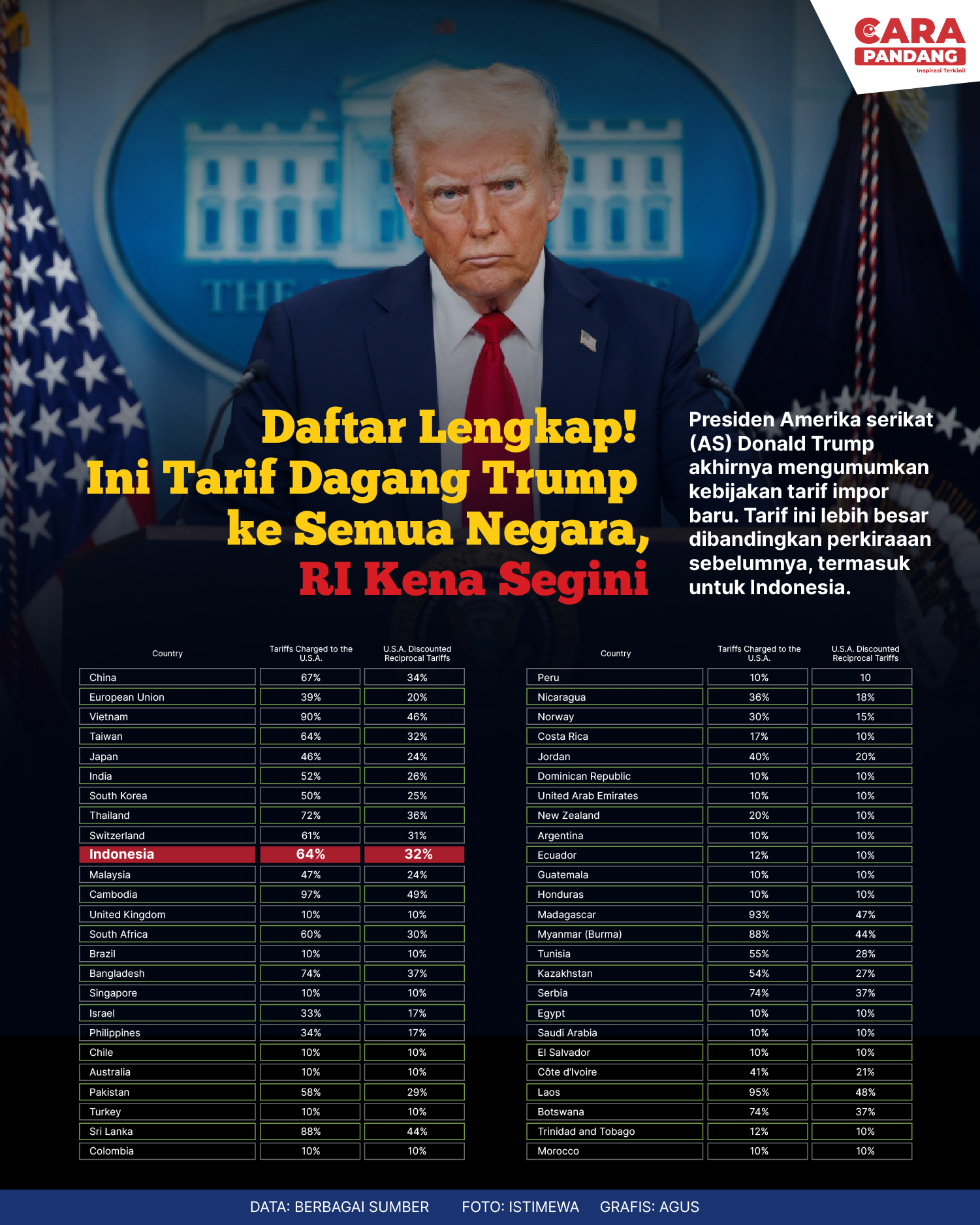 Beranda Infografis Tarif Dagang Donald Trump ke Semua Negara, RI Kena Segini Infografis Tarif Dagang Donald Trump ke Semua Negara, RI Kena Segini Penulis Amira Izzati - 03 April 2025 12:51 0 CARAPANDANG - Daftar Tarif Dagang Donald Trump ke Semua Negara Tags Berita Sebelumnya Sejumlah Harga Pangan 3 April 2025 Berita Berikutnya Para Tahanan Pro-Palestina yang Mogok Makan di Inggris Hadapi Risiko Kematian LEAVE A REPLY Cancel reply Comment: Please enter your comment! Name:* Please enter your name here Email:* You have entered an incorrect email address! Please enter your email address here Website: Save my name, email, and website in this browser for the next time I comment. Berita Teratas Pemimpin Thailand dan Kamboja Berbicara via Telepon dengan Trump, Bahas Konflik Perbatasan Potret Timur Tengah: Badai Musim Dingin Tewaskan Setidaknya 14 Orang di Gaza yang Porak-Poranda akibat Perang Program Edukasi Bermain Bantu Anak Atasi Kecemasan Saat MRI Gie, Prabowo Presiden Sekarang Masakan Italia Diakui sebagai Warisan Budaya Takbenda UNESCO Berita Terkait Berita Terkait Distribusi Bantuan Banjir Sumatra Lewat Udara Maliq - 06 Desember 2025 14:16 Dampak Banjir Aceh, Sumut dan Sumbar Zoel Rachman - 05 Desember 2025 08:47 Daftar Dosa Korupsi Netanyahu Zoel Rachman - 04 Desember 2025 12:52 Kutipan Pidato Hari Guru Nasional 2025 Maliq - 28 November 2025 12:12