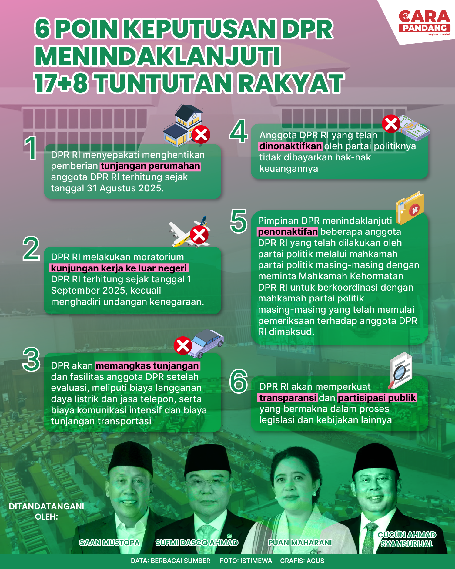 Beranda Infografis Tindaklanjut DPR Soal 17+8 Tuntutan Rakyat Infografis Tindaklanjut DPR Soal 17+8 Tuntutan Rakyat Penulis Amira Izzati - 07 September 2025 17:32 0 Tindaklanjut DPR Soal 17+8 Tuntutan Rakyat Tags Berita Sebelumnya Mantan Panglima TNI Sebut Jokowi Biang Kerusakan Bangsa Berita Berikutnya Presiden Prabowo Lantik Tujuh Anggota KY Periode 2025-2030 LEAVE A REPLY Cancel reply Comment: Please enter your comment! Name:* Please enter your name here Email:* You have entered an incorrect email address! Please enter your email address here Website: Save my name, email, and website in this browser for the next time I comment. Berita Teratas Pemimpin Thailand dan Kamboja Berbicara via Telepon dengan Trump, Bahas Konflik Perbatasan Potret Timur Tengah: Badai Musim Dingin Tewaskan Setidaknya 14 Orang di Gaza yang Porak-Poranda akibat Perang Program Edukasi Bermain Bantu Anak Atasi Kecemasan Saat MRI Gie, Prabowo Presiden Sekarang Masakan Italia Diakui sebagai Warisan Budaya Takbenda UNESCO Berita Terkait Berita Terkait Distribusi Bantuan Banjir Sumatra Lewat Udara Maliq - 06 Desember 2025 14:16 Dampak Banjir Aceh, Sumut dan Sumbar Zoel Rachman - 05 Desember 2025 08:47 Daftar Dosa Korupsi Netanyahu Zoel Rachman - 04 Desember 2025 12:52 Kutipan Pidato Hari Guru Nasional 2025 Maliq - 28 November 2025 12:12