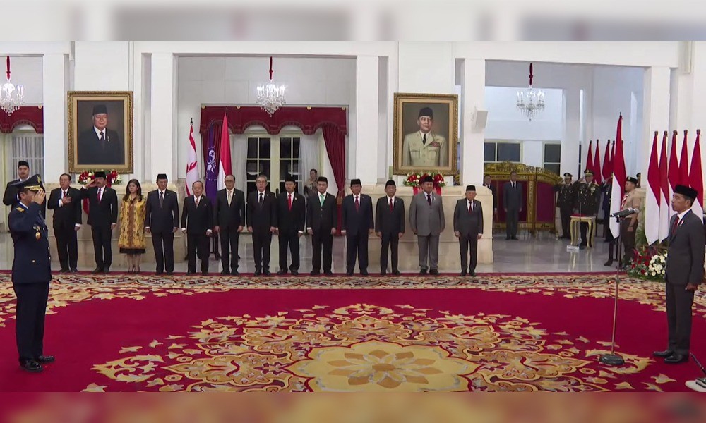 Usai pembacaan Keppres, Presiden Jokowi melakukan penyematan tanda jabatan, dilanjutkan dengan pengambilan sumpah/janji jabatan.