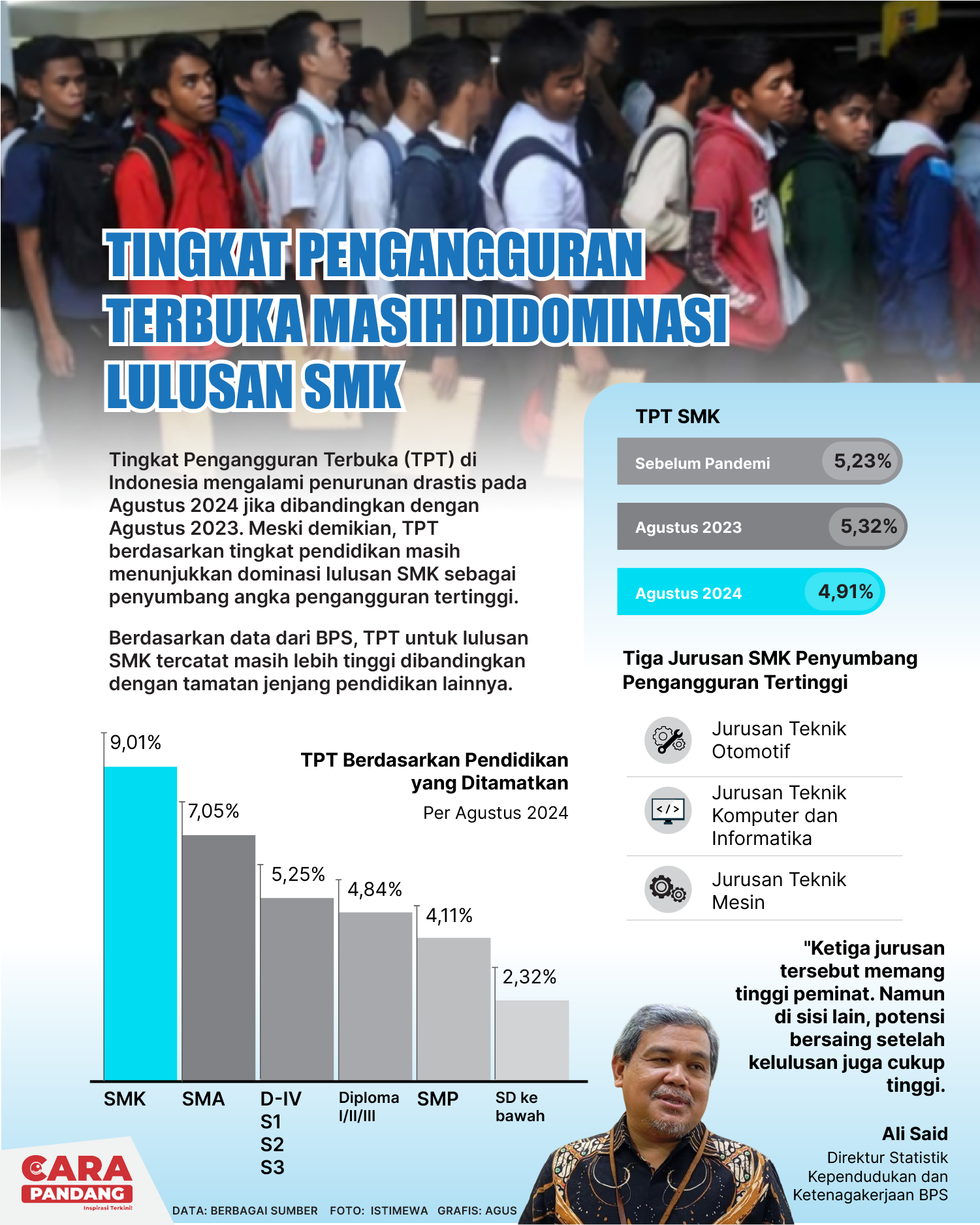 CARAPANDANG - Tingkat Pengangguran Terbuka (TPT) di Indonesia mengalami penurunan drastis pada Agustus 2024 jika dibandingkan dengan Agustus 2023. Meski demikian, TPT berdasarkan tingkat pendidikan masih menunjukkan dominasi lulusan Sekolah Menengah Kejuruan (SMK) sebagai penyumbang angka pengangguran tertinggi.