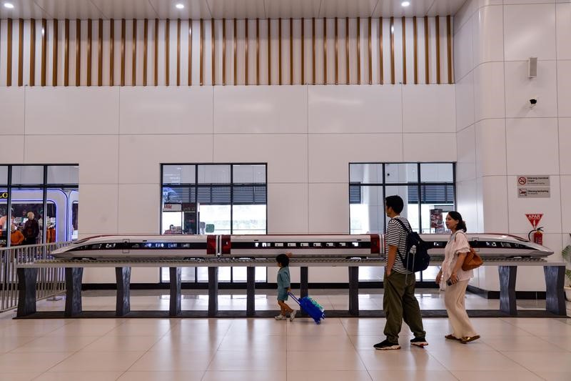 Sejumlah penumpang mengamati model rangkaian kereta electric multiple unit (EMU) Kereta Cepat Jakarta-Bandung (KCJB) di ruang tunggu Stasiun Halim, di Jakarta, pada 17 Juni 2024. (Xinhua/Xu Qin)