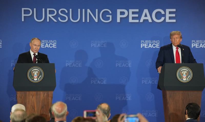 Presiden Amerika Serikat (AS) Donald Trump (kanan) dan Presiden Rusia Vladimir Putin menghadiri konferensi pers gabungan usai menyelesaikan pembicaraan mereka di Anchorage, Negara Bagian Alaska, AS, pada 15 Agustus 2025. (Xinhua/Wu Xiaoling)