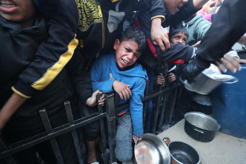 Warga berupaya mendapatkan bantuan makanan selama bulan suci Ramadan di Gaza City pada 4 Maret 2025. (Xinhua/Mahmoud Zaki)