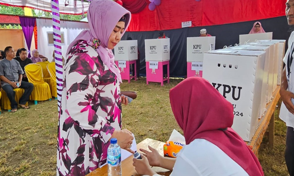 Wabup Suharsi Igirisa baru datang ke TPS yang tidak jauh dari rumahnya ini sekitar pukul 08.55 Wita. Ia nampak mengenakan setelan batik tunik.