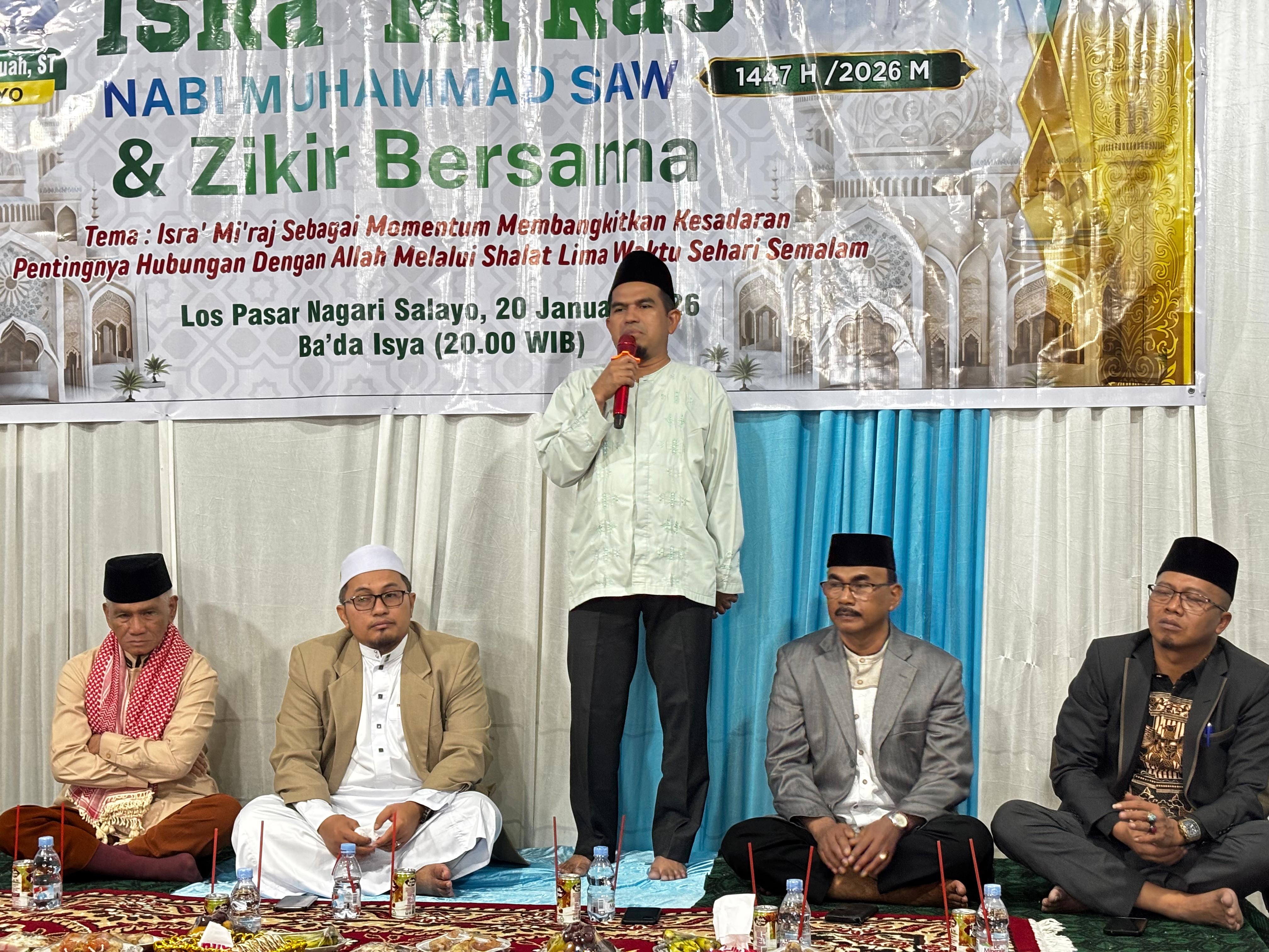 SOLOK, CARAPANDANG - Wakil Bupati Solok H. Candra, S.H.I. menghadiri peringatan Isra Mi’raj Nabi Muhammad SAW yang digelar di Nagari Selayo, Kecamatan Kubung, Kabupaten Solok, Selasa (20/01/2026). Kegiatan berlangsung di Los Pasar Selayo, tepat di depan Kantor Wali Nagari Selayo, dan dihadiri oleh unsur pemerintahan serta masyarakat setempat.