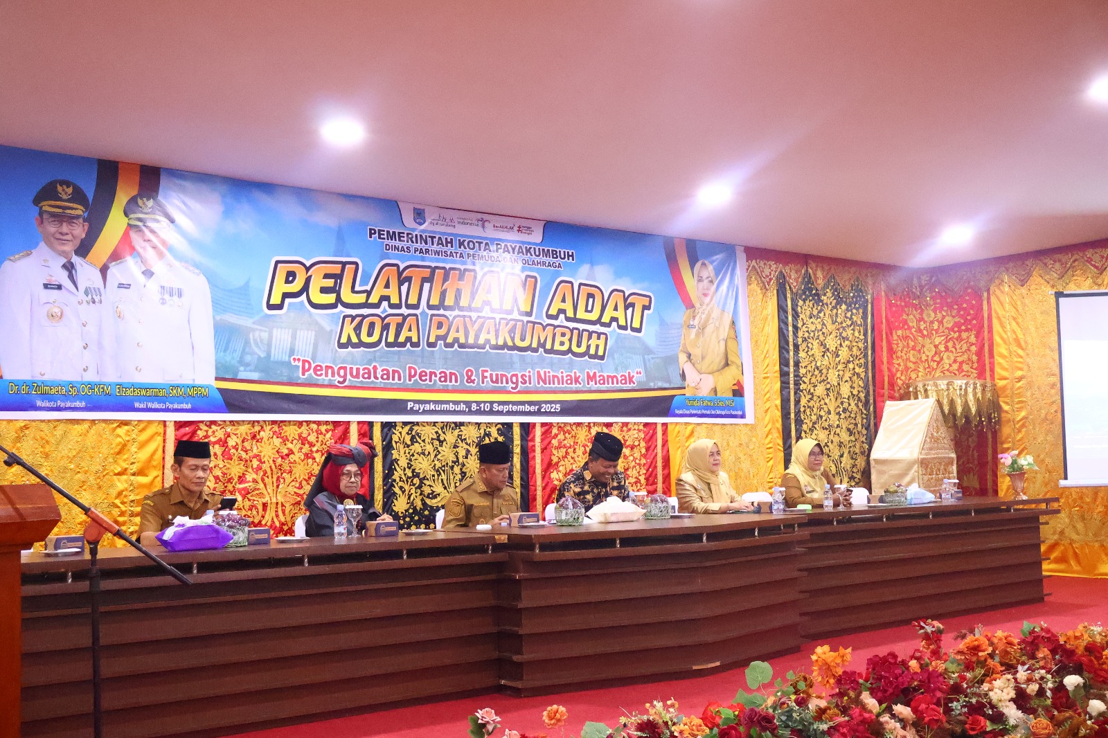 PAYAKUMBUH, CARAPANDANG - Wakil Wali Kota Payakumbuh secara resmi membuka Pelatihan Adat Kota Payakumbuh Tahun 2025 dengan tema “Penguatan Peran dan Fungsi Niniak Mamak” di Ruang Perpustakaan Umum Daerah Lantai 3 Bukik Sibaluik, Senin (8/9/2025).