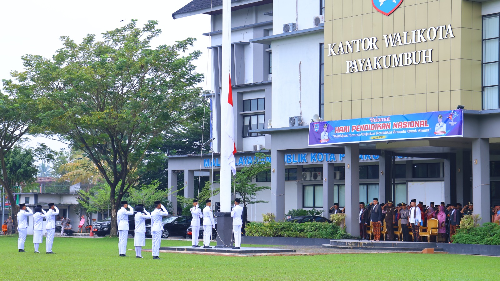 PAYAKUMBUH, CARAPANDANG - Wakil Wali Kota Payakumbuh Elzadaswarman menjadi pembina upacara peringatan Hari Pendidikan Nasional (Hardiknas) Tahun 2025 yang digelar di Halaman Balai Kota Payakumbuh, Jumat malam (02/05/2025). Upacara yang berlangsung khidmat itu dihadiri oleh Sekretaris Daerah Rida Ananda, para asisten Setdako, unsur Forkopimda, kepala OPD, serta kepala sekolah se-Kota Payakumbuh.